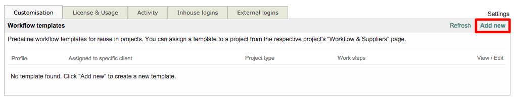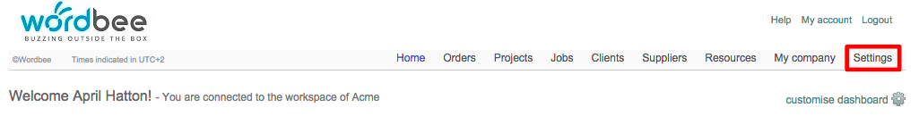 To view and create workflow templates, you must first click on Settings located on the far right of the toolbar at the top of the screen.