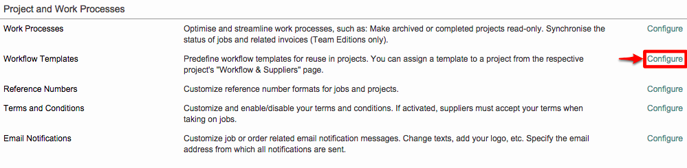Scroll down to the Project and Work Processes section of this screen. Then click on Configure to the right of the Workflow Templates option.