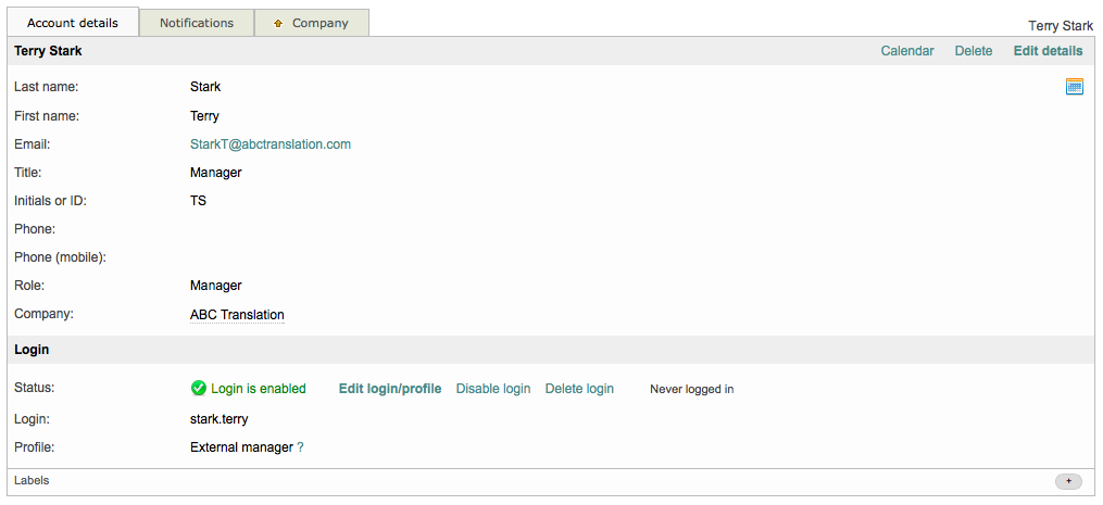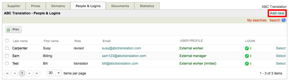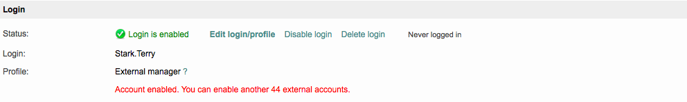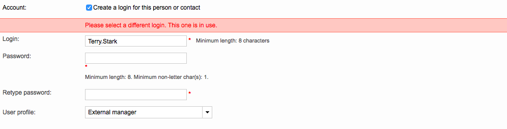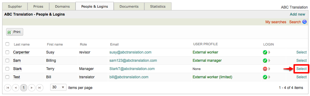 Any existing external user which has never had a login or had their login previously deleted, will need have one defined again in the system. To define a login for an existing user, click on Select next to the user's login within the list. In this example, Terry Stark is chosen as the user currently has no profile or login.
