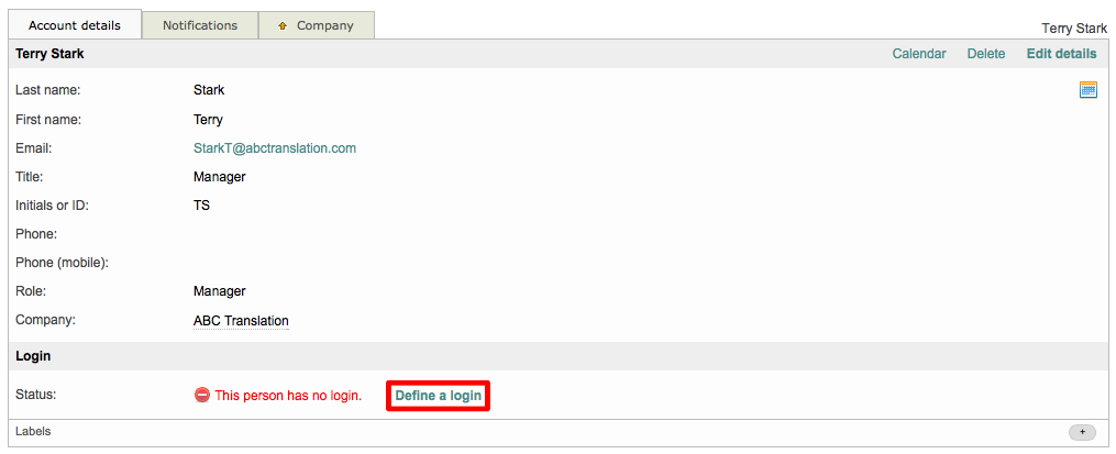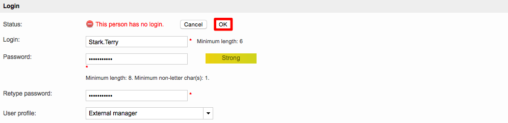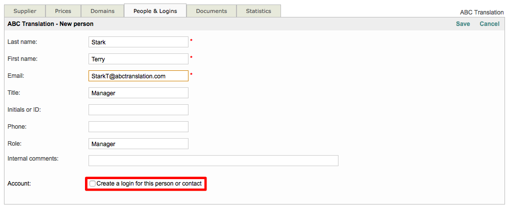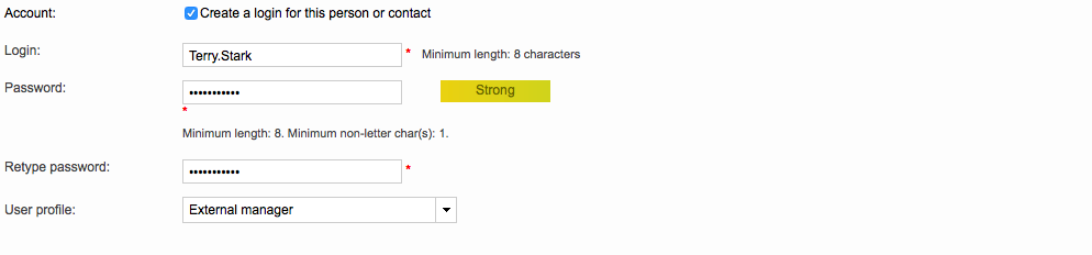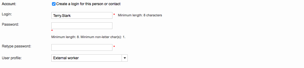 Then enter the user's information and tick the checkbox next to Create a login for this person or contact within the login section.