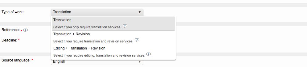 User options will appear as selections for the Type of Work option on the order form, as shown below.