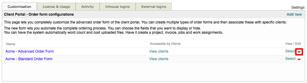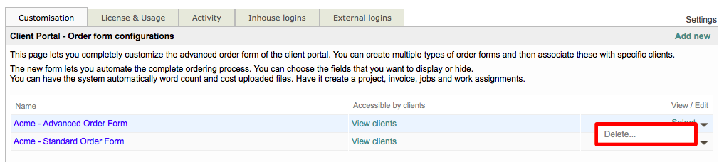Besides the classic order form, you also have the option to create a customized order form for clients and internal use. To add a new order form or remove one from the system, you will need to complete the following steps: