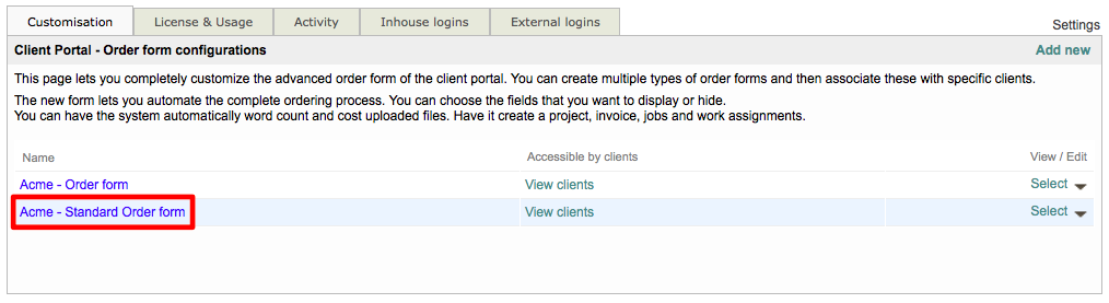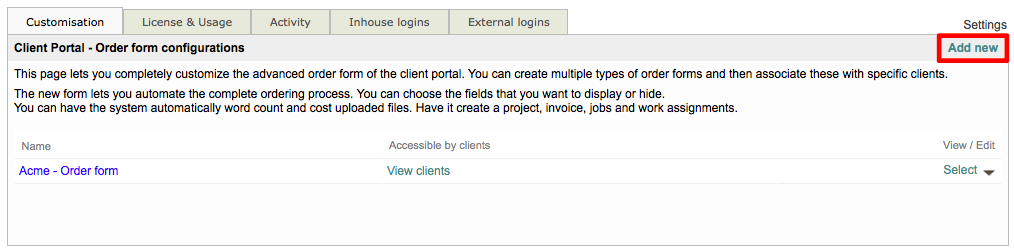 To add a new form, first, go to Settings > Client Portal > New Order Form and click on Configure. Then click on Add New in the upper right corner.