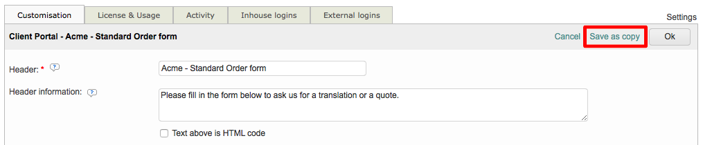 Copy - Copying a form is a good option when you want to quickly configure the form, as the configuration settings for each defined user option are copied to the new form. This allows you to simply change the header information based on the client and alter the workflow without having to configure every aspect of the order form each time.