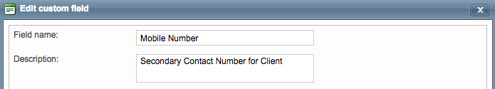 For this example, we will be showing how to create the Mobile Number custom field for projects in the system. To begin, first enter a Field Name for the custom field by clicking on the text box and entering the desired name. You may also add a Description in the same manner, but only the Field Name is required.
