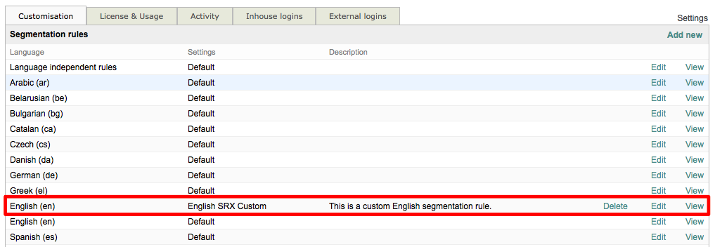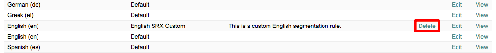 The Default Settings for language-specific SRX Rule configurations may not be removed from Wordbee Translator; however, if you have created a custom SRX rule configuration, an option is provided for deleting them from the system. Click on Delete to the right of the SRX Rule configuration you want to remove from Wordbee Translator.