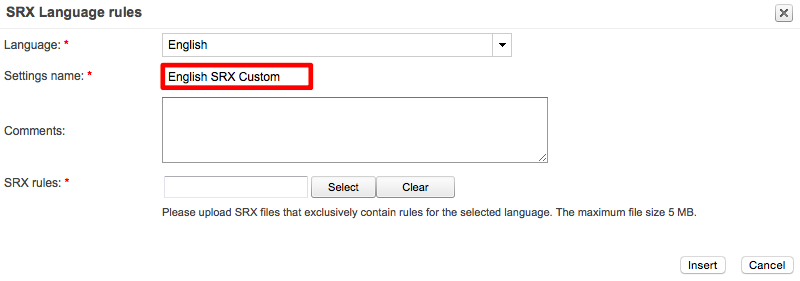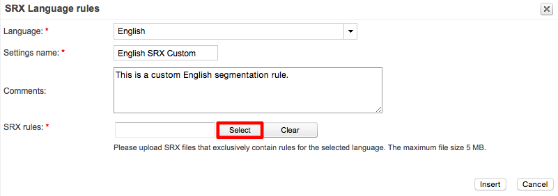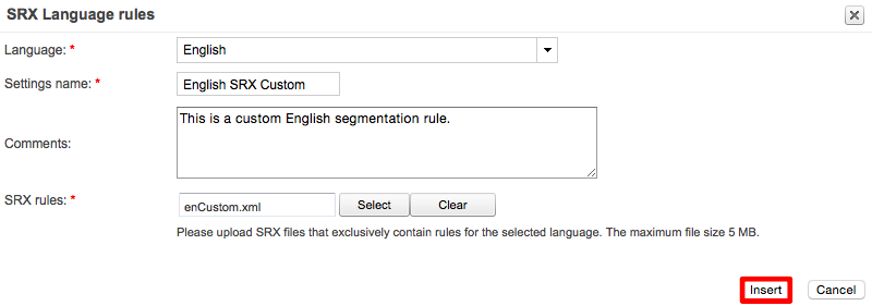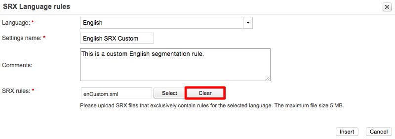 The file name will appear in the SRX Rules section as shown below. If you want to choose a different file, click on Clear and then follow the steps above to make another selection.