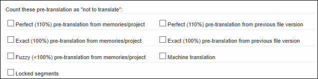 Below you can view a description of all the settings you can configure for counting words, characters, segments, fuzzy matches and pre-translations. By default, Wordbee applies a counting algorithm that is compatible with other translation tools. Expand each option to learn more.