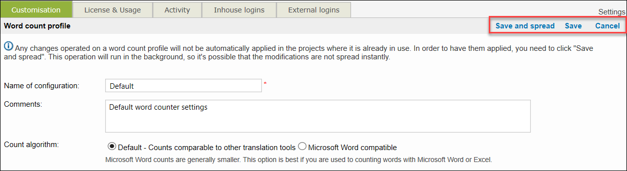 In Translation Settings, use Save and spread when updating the settings of a word count profile. This action will spread the changes to every ongoing project in which the word count profile has been assigned.