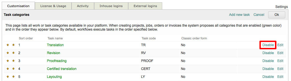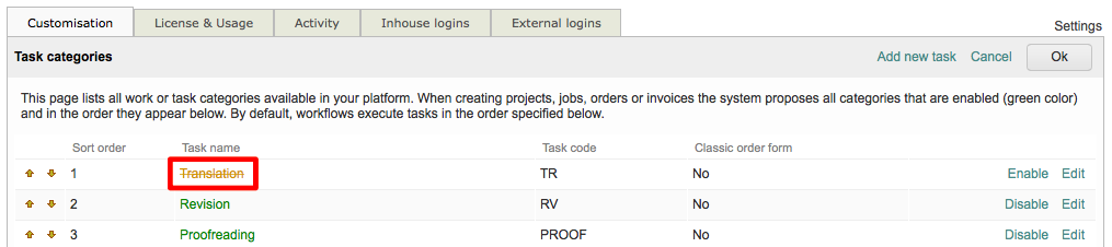In this example, Translation has been disabled. Disabled task categories will appear orange with a strikethrough and have an Enable option, as shown below:
