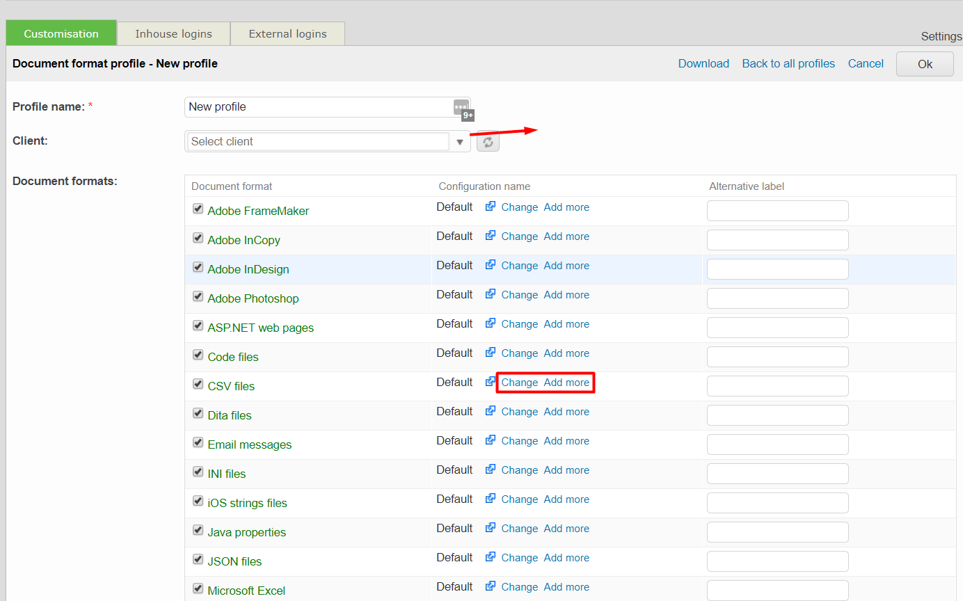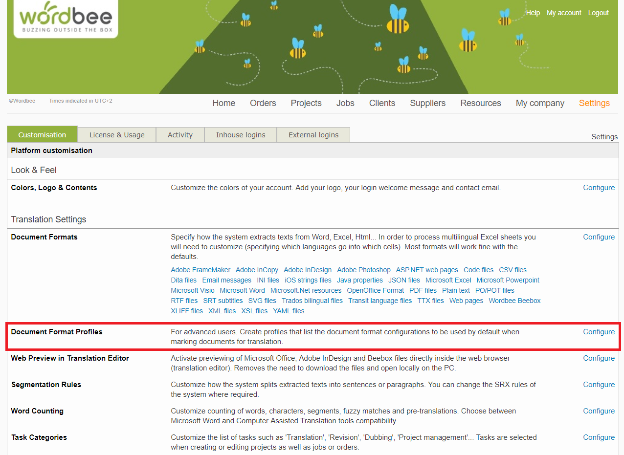 In the Translating Settings section, you will see the Document Format profiles. Click on Configure to create a new profile.