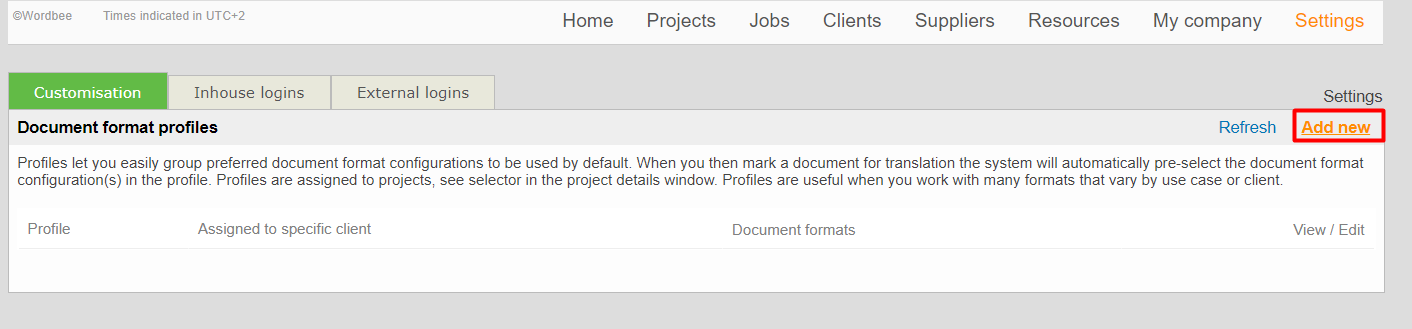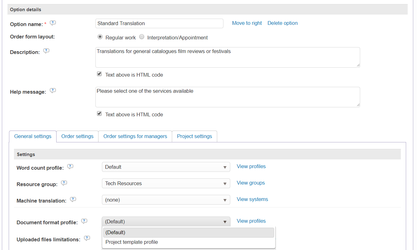 These profiles specify the document format rules to use by default. Profiles can then be assigned to projects or options in your order form.