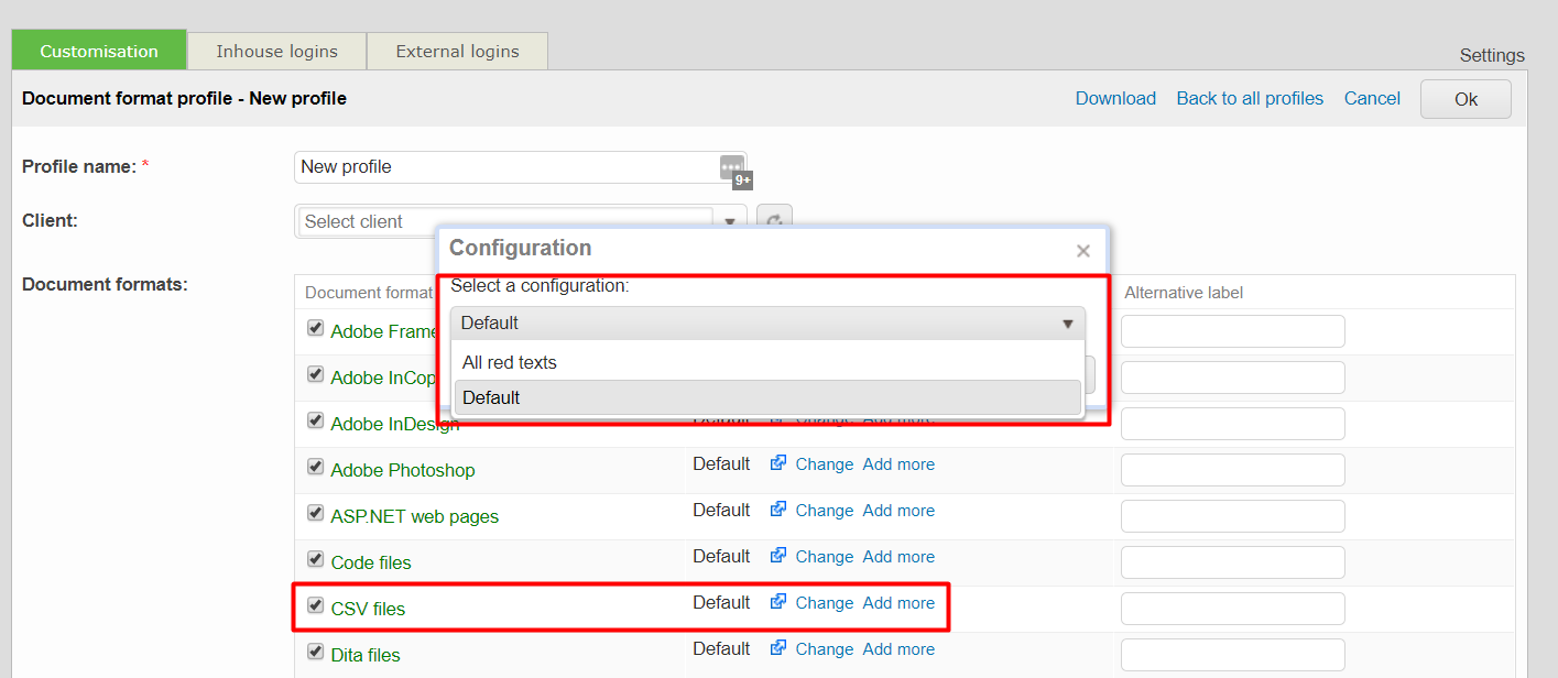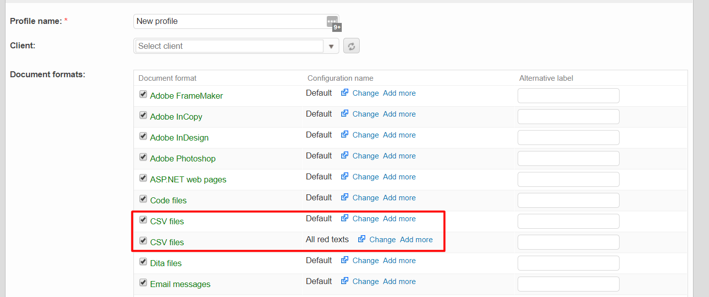If you are manually marking the file for online translation then the configurations coming from your document format profile have higher priority and will be on top of the list, highlighted with a different color. This makes it easy for the user to differentiate them from any other configuration available for that file type.