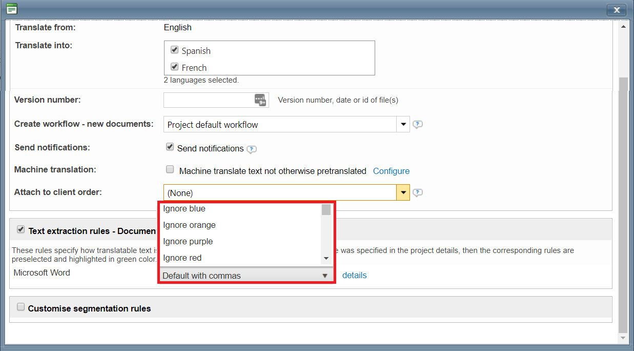 When marking the file for online translation, the system will select the set of rules defined as default from the configuration attached to the project.