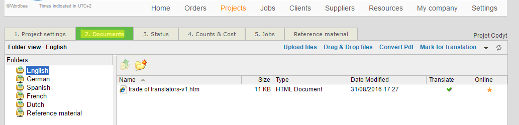 If you have already translated the first version of a document in a Codyt project, and now wish to translate a second version of that same document, the first action to undertake consists in reaching the 'Documents' tab of your project: