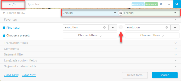 Click Search to display those segments in the Translation Editor that meet the filtering conditions or use Reset form to clear the search box.