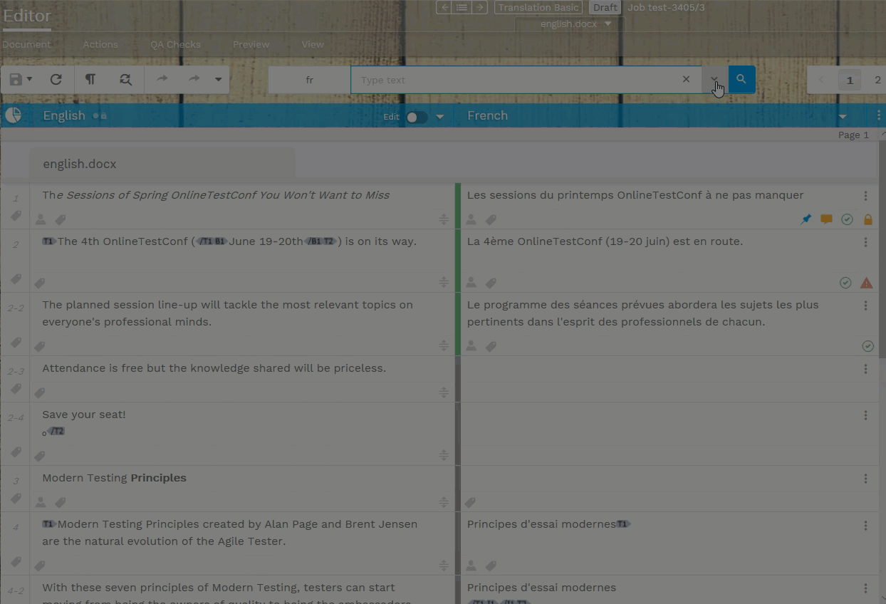 Translation documents may contain a large number of segments that are difficult to search manually. Use the Power Search Bar above the Translation Editor grid to perform simple and advanced text searches inside your segments or filter segments by various criteria. You can perform a simple text search directly in the search box or set conditions for filtering the segments in the drop-down menu of the Search Bar. It is possible to perform bilingual text searches and apply separate filters for each language.