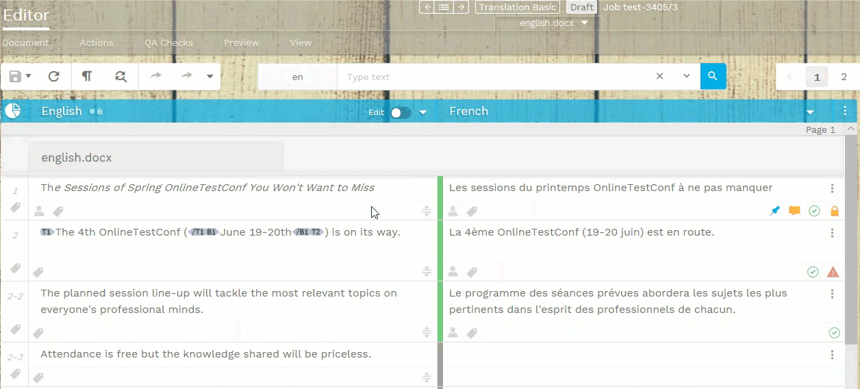 Translation fields | Filter texts by their status None, OK, Error Filter texts by their bookmark value None, Blue, Red Missing or bad translations Filter segments that contain no translations or have been assigned a red status. Language labels Filter segments by labels relative to the selected language. Last change by Filter segments according to their last change (e.g. human or machine edits). Previously changed by Filter segments according to all the changes made (e.g. human or machine edits). Last update date Filter segments that have been edited within a given period. QA results Filter segments with Quality Assurance (QA) issues. Locked Filter segments that have been locked. Missing translation Filter segments containing no translation. Has history Display segments that have a history: e.g. postedited. Minimum length Only display segments with at least X characters. Maximum length Only display segments with a maximum of X characters. Repetitions Filter repetitions in three modes: Hide repetitions, show document repetitions, and show document & project repetitions |