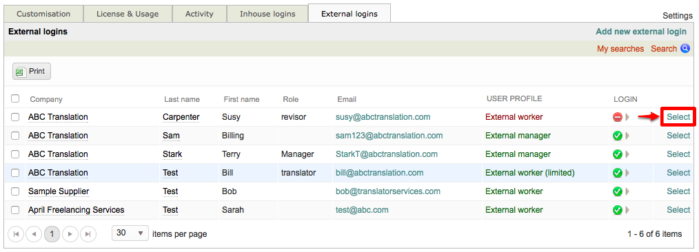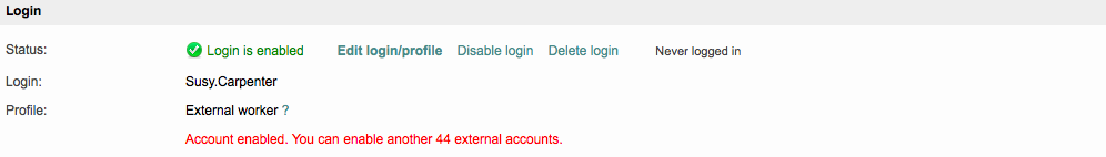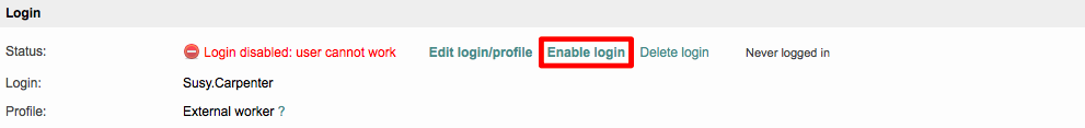 The login will automatically be enabled, as all information for logging in remains intact when an external login is disabled. Now the user can log into the system and perform work again.