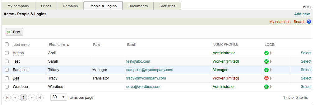 A disabled inhouse login may be enabled at any time by going to Settings > Accounts and Security > Inhouse Logins, clicking on Configure, and then clicking on Select to the right of a displayed user. A disabled login will have a