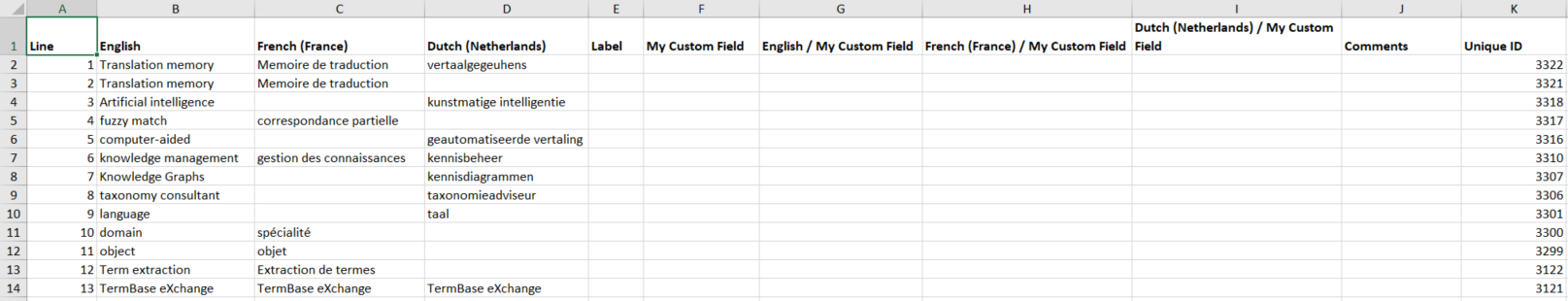 Here is an example of a termbase downloaded in XLSX format. Default fields: