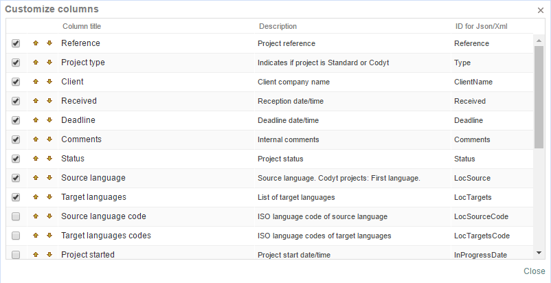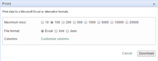 Most lists in Wordbee Translator include a Print button to export the filtered data. Use it to quickly export projects, suppliers, clients, orders, invoices and jobs to either EXCEL, JSON or XML. And, customize the columns you want to export! Note that the export feature is available to all your users and for all the data they have access to. For example a supplier can export his/her jobs as well as his/her invoices.