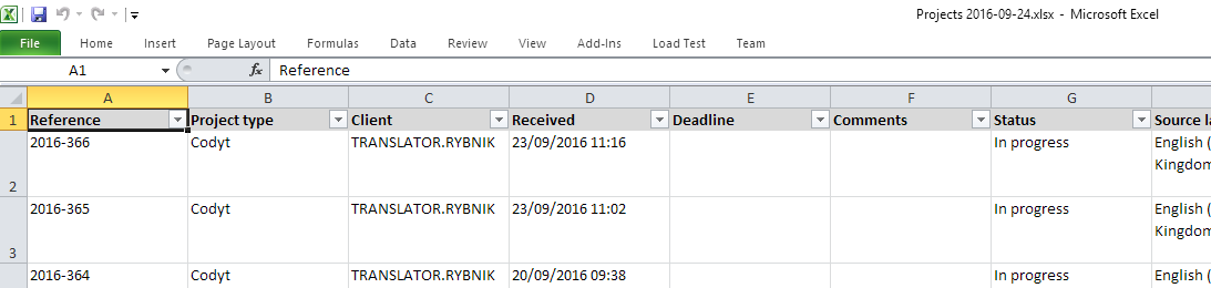 Choose the maximum rows to include, a format (Excel, XML, JSON) and finally click Download. A typical Excel export of projects looks like this: