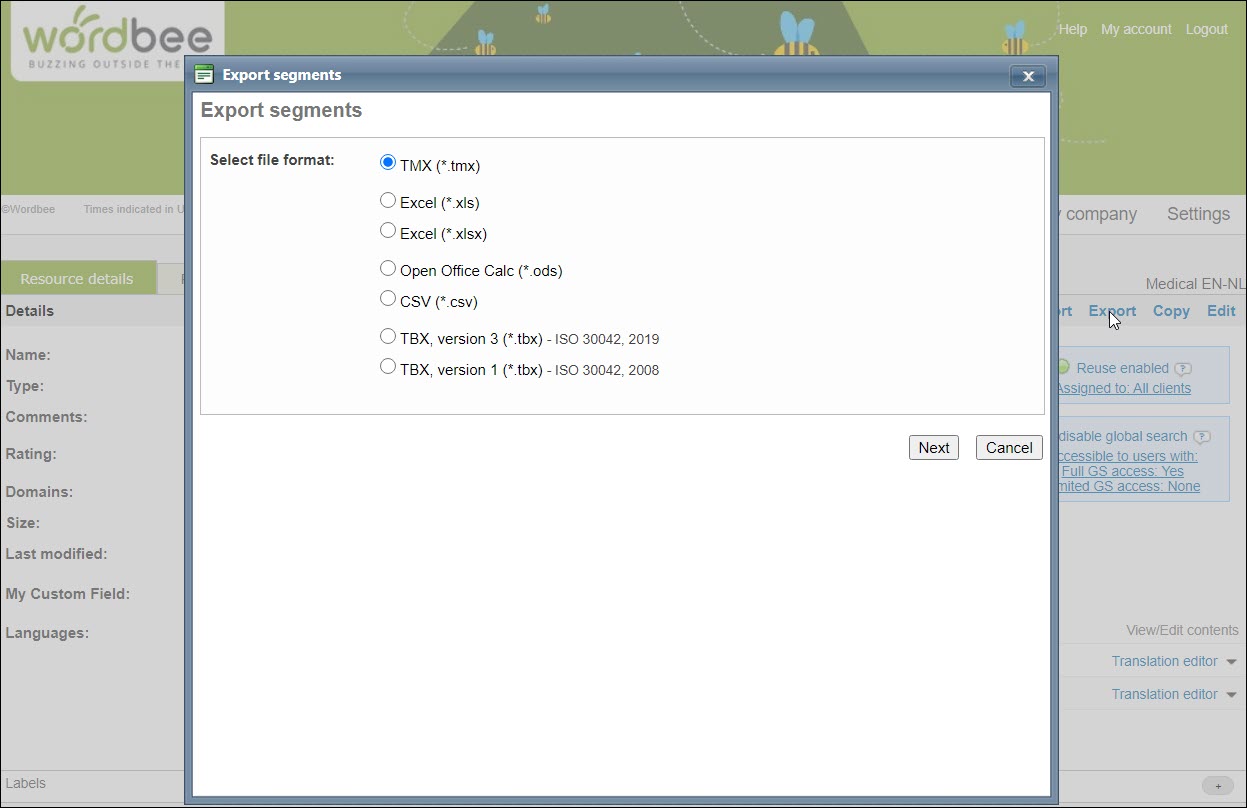 We recommend that you export the Translation Memories/Project Memories in TMX format and the terminology databases in TBX format, which are the standard formats used in the translation industry. If you just wish to be able to easily navigate the results of your resources, then you may want to export them in Excel (.xls) format. See this GIF video to learn how to export a termbase.