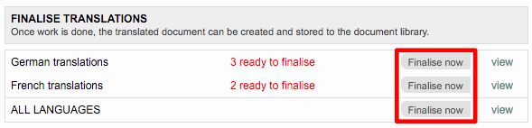 In the Finalize Translations section you will see an option to finalize translations based on the target language. You can also finalize all translations at once for a project. Click on Finalize Now for the translations you want to finalize.