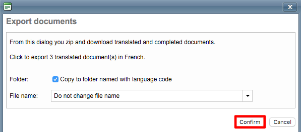 After clicking on Finalize Now, a new pop-up window will appear. You will need to click on Confirm to create and store the translated documents. If you do not want to finalize them right now, click on Cancel to exit the pop-up window.