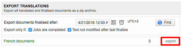 The Export Translations section on the Status Tab can be used to export any documents that were finalized after a certain date.