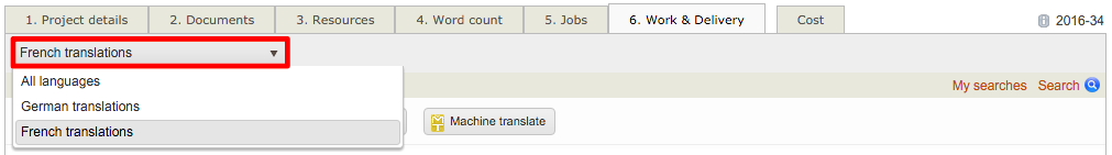 If more than one target language is included in the project, you will need to use the drop-down menu at the top right of the Work & Delivery Tab to choose the additional target languages and finalize those documents.