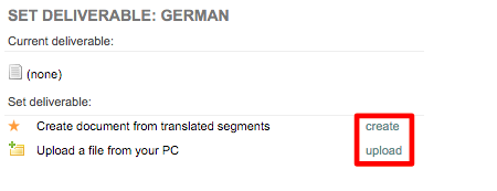 Then click on Create to create a document from the translated segments or Upload to upload the completed translation (when another tool has been used).