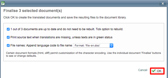 Additionally, another option is provided for appending the language code to the file name. This is disabled by default, but can be enabled by clicking on the checkbox for the option. Click on OK when finished or Cancel to exit without finalizing the selected documents.