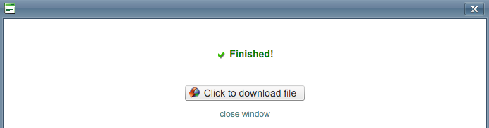 After the file has been created and is ready to download, you will see the following pop-up window. Use the Click to download file option to download the ZIP file containing the chosen documents. Click on Close Window to exit this pop-up window.