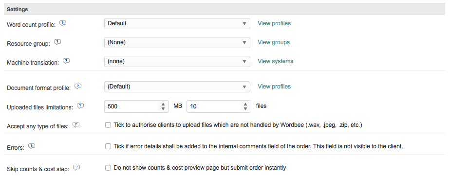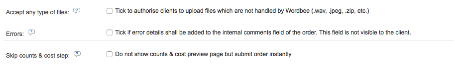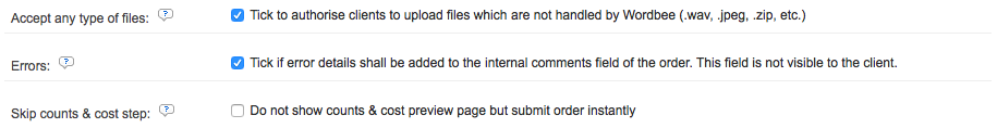 - Accept Any Type of Files - Sometimes the client will need to upload a file that is not handled by Wordbee, but imperative to the order. For example this might be a reference material or other item that does not need to be translated, but is necessary to understand or complete the order. In these situations, this option should be ticked.