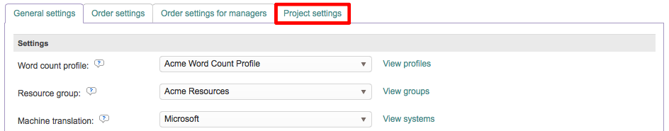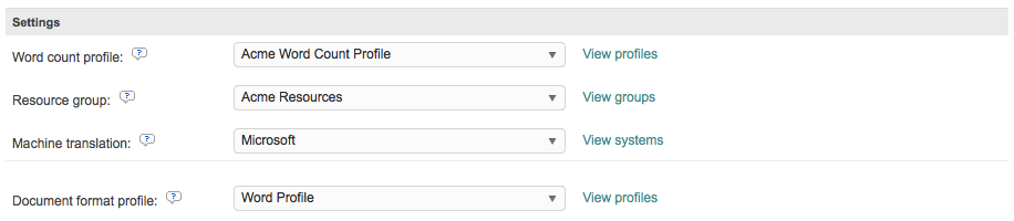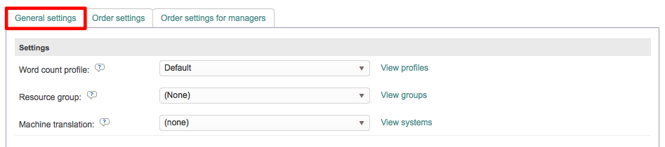 The Settings configuration options are where you will configure automation for word counts, resources groups, machine translation, document profiles, and general settings for errors, file uploads, etc.