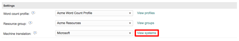 At least one Machine Translation System must be configured to see selection options in this drop-down menu. To learn more about configuring this information, please see the https://wordbee.atlassian.net/wiki/spaces/WBT/pages/711232 section of the documentation.