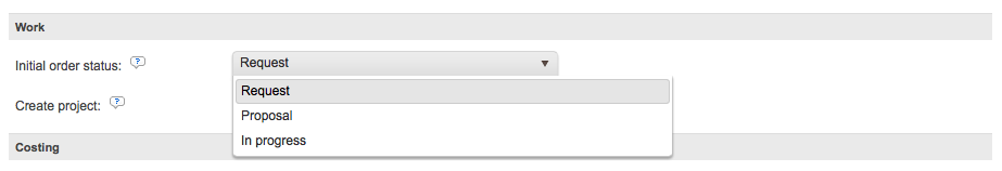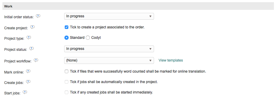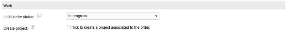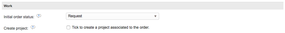 The Work section applies to the initial status of the order and whether or not a project should be created when the order is submitted by the client. Additionally, you may configure the type of project, it's status, the project workflow, and other items to further automate this process in the system for new orders.
