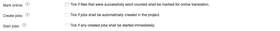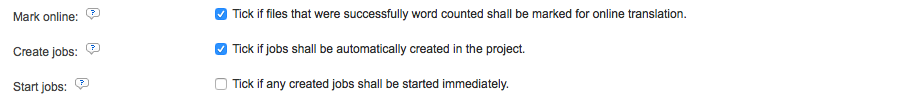 For example, you might want all uploaded files to be marked for online translation and the related jobs created but not started . In this instance the jobs will be created, but not started. To do so, you would tick the checkbox next to the first two options, as shown below: