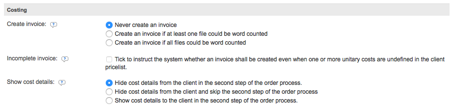 If the cost details are displayed, the client will see the word counts and all cost information. If they are hidden, this information will not be displayed during the second step of the ordering process. To change this setting, simply tick the radial for the desired selection to the right of the setting's name. In this example, we will be showing the cost details to the client.