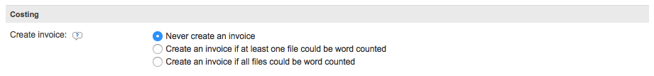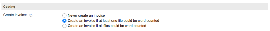 To make a selection, tick the radial next to the appropriate description. For this example, the invoice will be created when at least one uploaded file can be word counted. This selection has been made because the Skip Counts & Costs Step setting has been disabled (unticked). For more information about this configuration setting, click here.