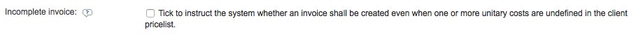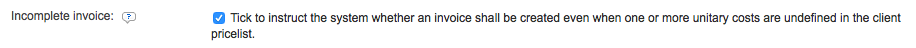 The Incomplete Invoice setting may be used to ensure that an invoice is created even if one or more costs have not been defined in the pricelist. If this option is disabled (unticked), as it is by default, then a single undefined unitary cost will prevent invoice creation.