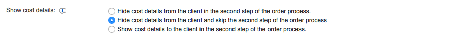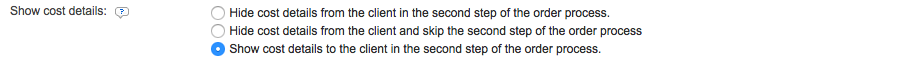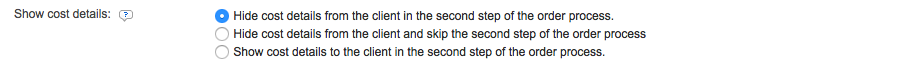 The Show Cost Details setting contains three options and your selection will be determined from additional settings for the new user option. By default, "Hide cost details from the client in the second step of the order process" is the chosen setting.