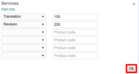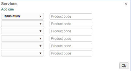 A popup window will appear where you may use the drop-down menu to select one or more Services and may enter a Product Code for each chosen service.