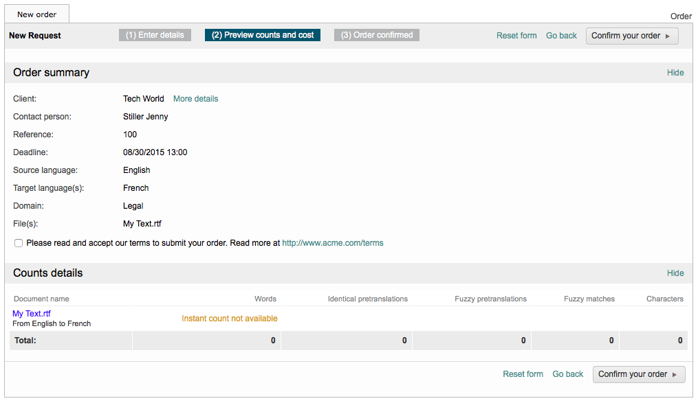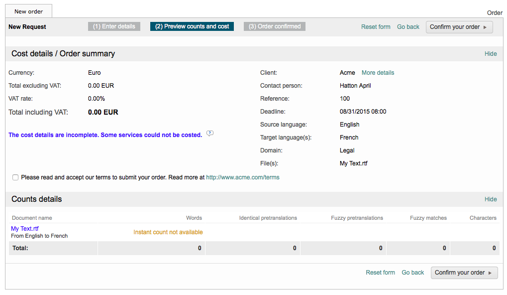 - Skip Counts & Costs Step - This is an important option as what is chosen here will affect later configuration settings in the Costing section on the General Settings Tab. If this option is enabled, then the client will not be shown a preview of the costs and the word count process will be skipped. This might be necessary in situations where you want to send a quote to the client after the order is submitted. When disabled, the client will be shown the costs before confirming the request.