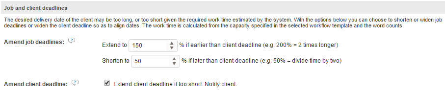 When ticking 'Start jobs', additional sub-options are displayed on the page. These options, (visible in the screenshot below) are aimed to adapt jobs and client deadline. Indeed, the desired delivery date of the client may be too long, or too short given the required work time estimated by the system. With the options below you can choose to shorten or widen job deadlines or widen the client deadline so as to align dates. The work time is calculated from the capacity specified in the selected workflow template and the word counts.
