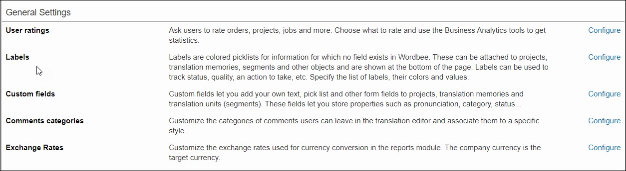 The articles in this section show how to configure custom information in your Wordbee Translator that is not provided out-of-the-box, such as comment categories, custom fields, exchange rates, labels and user ratings.