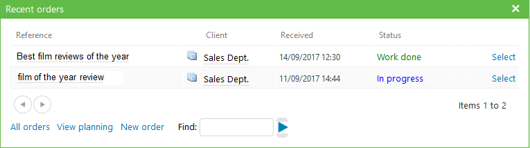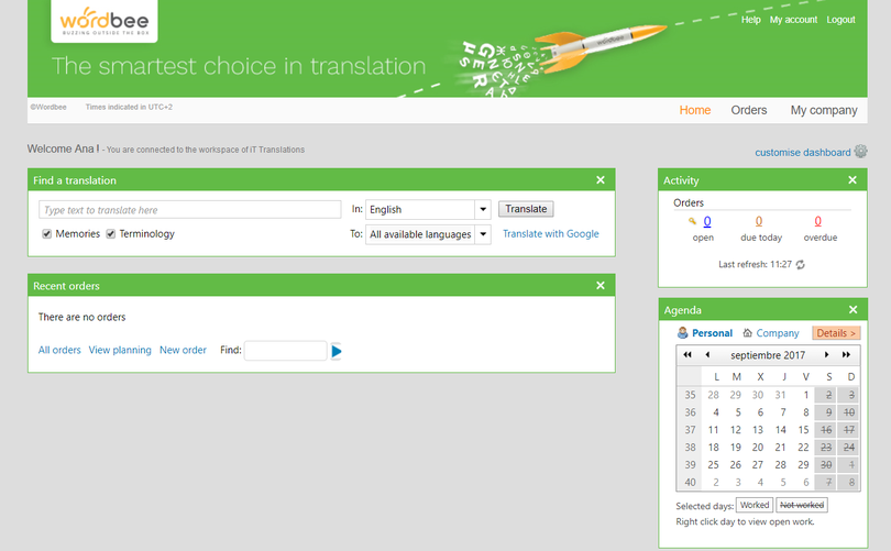 Here you can search for translations, follow recent orders, have an overview of the current activity, and navigate your calendar, where important events can be highlighted.