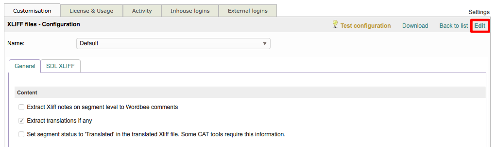 Step 1: You will need to click on Edit to begin making changes to the chosen XLIFF configuration. If only the Default configuration is present for XLIFF files, simply edit it and then Save as New when finished.